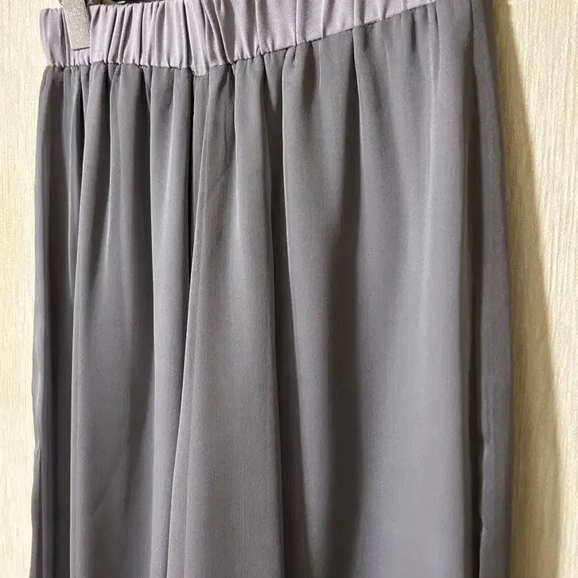 방문해 주셔서 감사합니다 ♪ 연한 라벤더 색상의 팬츠에 그레이 색상의 시어 원단을 덧댄 세련된 와이드 팬츠입니다. 떨어지는 느낌도 있고, 소재도 폴리에스테르라 주름도 잘 지지 않아 산뜻하게 착용하실 수 있습니다. 허리는 전체 밴딩이라 편안합니다.