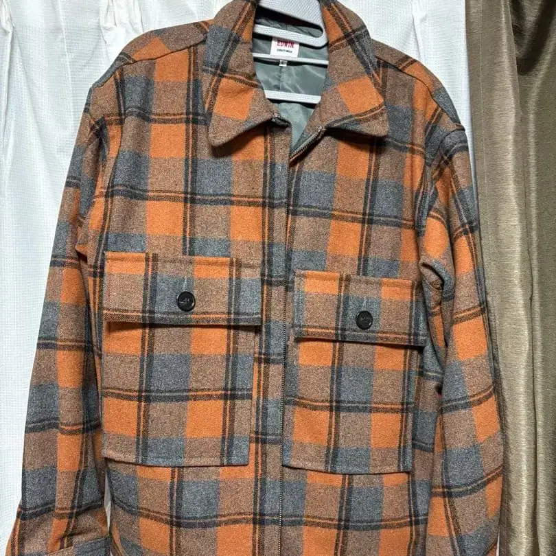 오렌지와 그레이 체크 무늬, 울 혼방 EDWIN 자켓. - 브랜드: EDWIN - 색상: 오렌지 그레이 체크 무늬 - 사이즈: L - 디자인: 프론트 포켓 부착 - 소재: 울 혼방 방문해 주셔서 감사합니다. 사이즈 - L