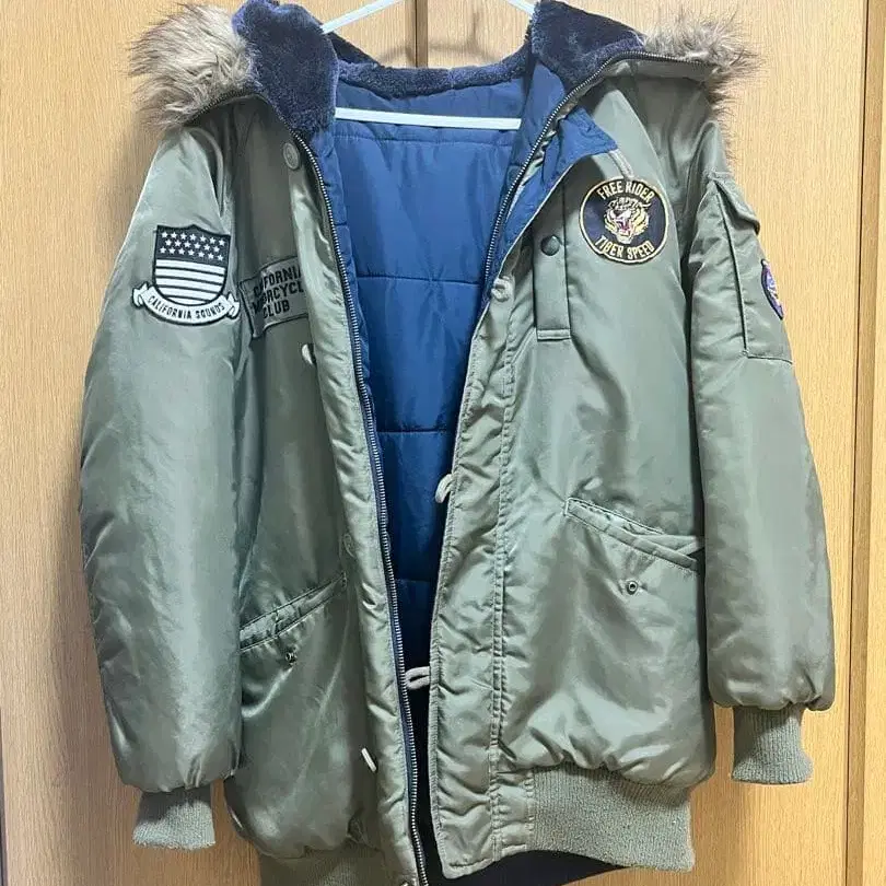퍼가 달린 후드와 패치 디자인의 밀리터리 자켓. - 색상: 올리브 그린, 블루 - 디자인: 퍼가 달린 후드 - 특징: 리버서블 - 스타일: 밀리터리 자켓 - 뒷면 디자인: 후드 부착 - 포켓: 앞면에 2개의 포켓 방문해 주셔서 감사합니다. 가격 협상 가능한 한 대응해 드리겠습니다. 사이즈 - M