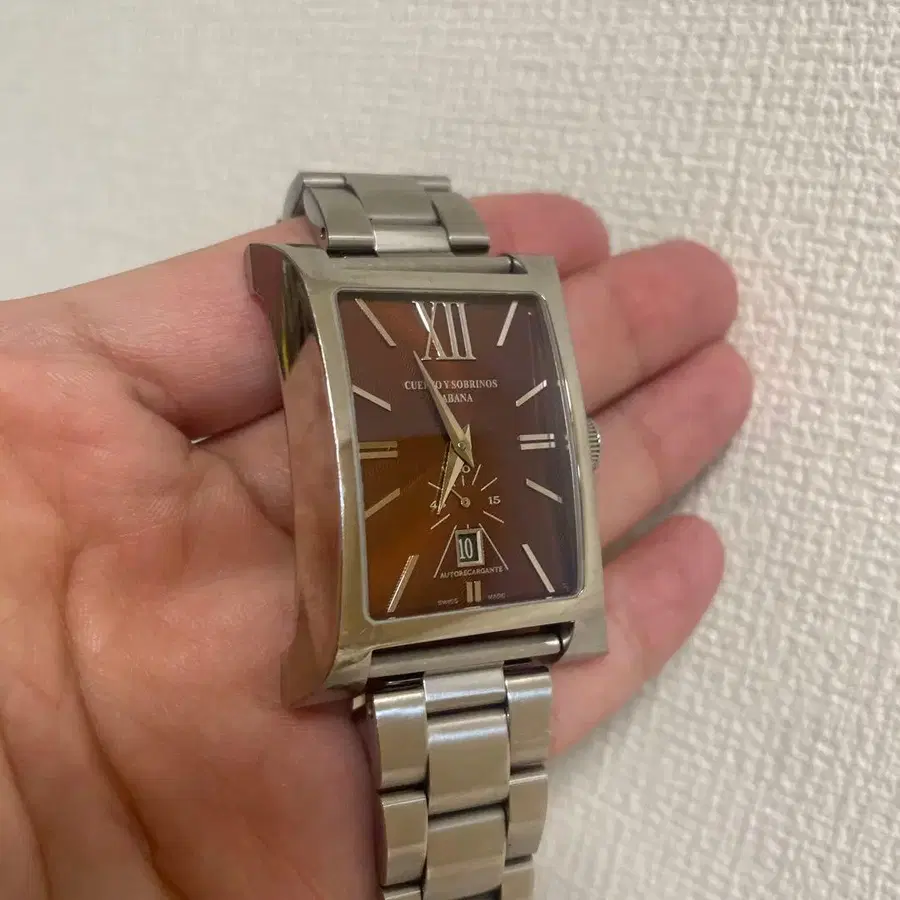 로마 숫자 인덱스를 갖춘 브라운 다이얼의 자동 손목시계.