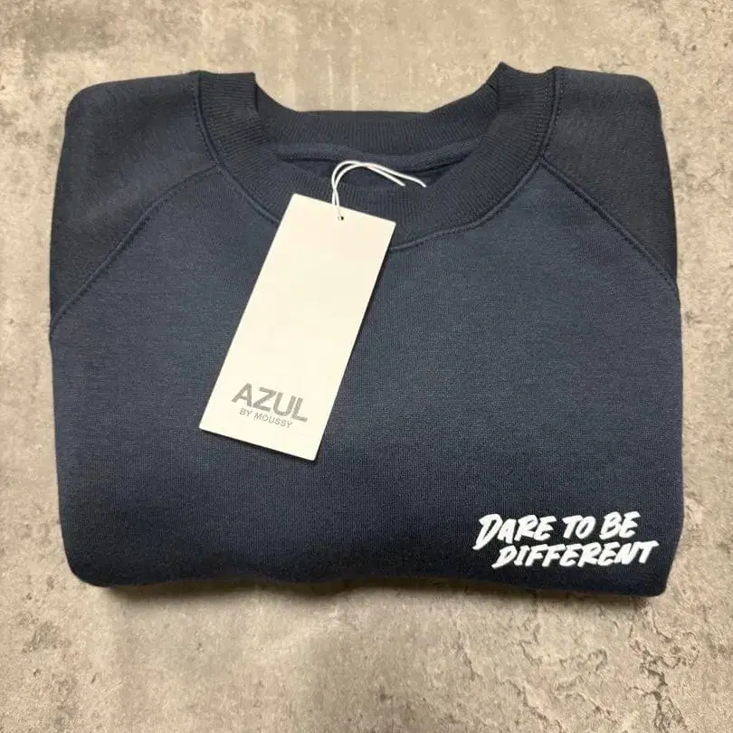 다크 블루 색상의 크루넥 맨투맨입니다. 앞면에 [ Dare to be different ] 디자인이 있습니다.