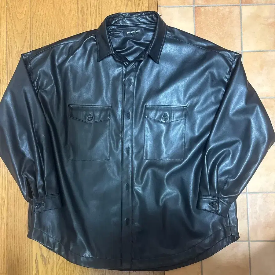 합성 피혁 소재의 블랙 버튼 셔츠, 앞면에 포켓 부착.
