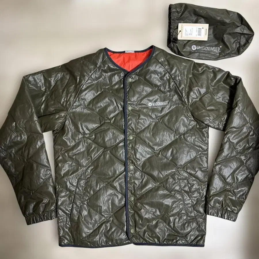 올리브 그린 색상의 퀼팅 자켓, 오렌지 색상 안감으로 패커블 디자인.