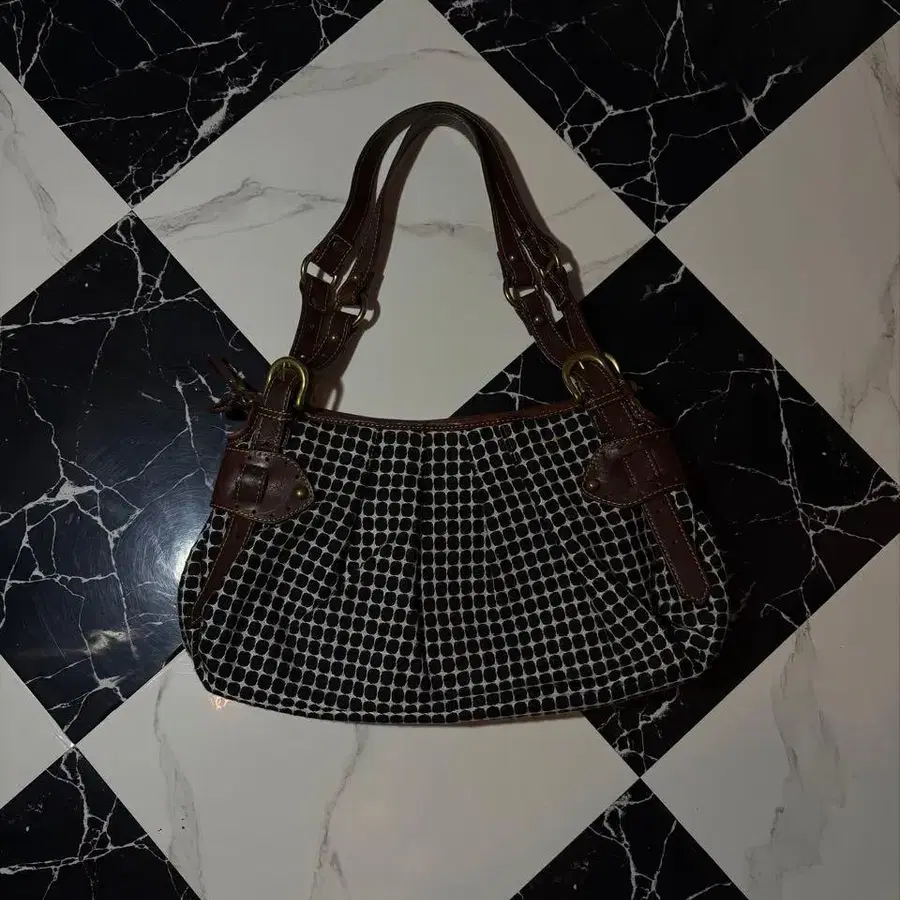 체크 무늬 핸드백, 브라운 스트랩 포함.