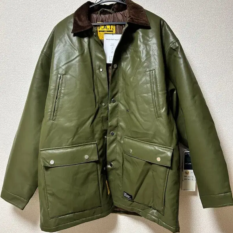 FAT의 헌팅 자켓입니다. 사이즈는 FAT 사이즈입니다. 구매 후 봉투에 넣어 보관했으며 집 안에서 시착만 해봤을 뿐 한 번도 입고 외출한 적이 없습니다. 비슷한 자켓을 몇 벌 더 가지고 있어 전혀 입지 못했기 때문에 정가보다 조금 저렴하게 판매합니다. 자잘한 주름감과 부드러운 터치가 인상적인 합성 피혁을 사용한 헌팅 자켓. 넉넉한 실루엣으로 후드 맨투맨이나 니트를 이너로 매치하여 볼륨감 있는 릴랙스 스타일을 즐길 수 있는 아이템입니다. 충전솜을 넣어 방한성을 높였으며, 용도에 맞춘 포켓 사양도 기능적입니다. 코듀로이 카라, 뒷면의 게임 포켓이 코디네이트에 악센트를 더해줍니다. 허리의 로고 자수와 포켓의 브랜드 네임도 은은하게 존재감을 드러냅니다.