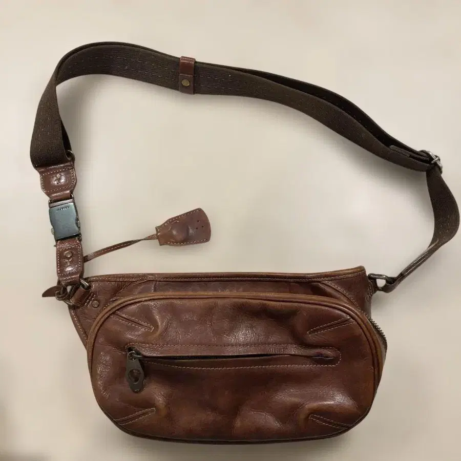 브라운 가죽 소재의 바디백, 2개의 컴파트먼트로 수납력 뛰어남.