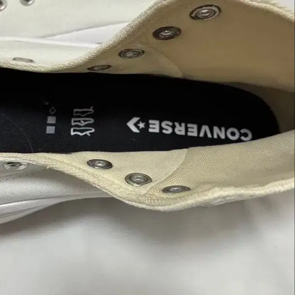화이트 색상의 캔버스 소재로, 스타일리시한 하이컷 디자인의 스니커즈. - 브랜드: CONVERSE - 색상: 화이트 - 모델명: ALL STAR - 스타일: 하이컷 - 소재: 캔버스 통굽 모델 2년 전 한국의 컨버스 샵에서 구매 후 2, 3회 착용했지만 특별한 얼룩 없이 비교적 새상품급입니다. 캔버스 소재 특성상 약간의 노란 끼가 있으며, 표백하면 깨끗해집니다. 희귀한 모델이라 구하기 어렵습니다. 신발 클리닝을 맡긴 후에는 착용하지 않았으며 끈은 포함되어 있지 않습니다. 또한 상자는 촬영용입니다. 방문해 주셔서 감사합니다. 메인 컬러 - 화이트 얼룩, 찢김, 냄새 등 - 없음