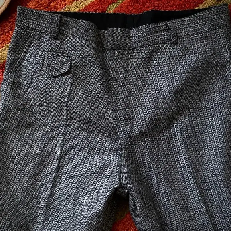 빈티지 복고풍 느낌의 트위드 헤링본 디자인 그레이 슬랙스 샘플 상품으로 택류는 없지만, 울 폴리에스테르 혼방입니다. 사이즈 실측치수입니다. 허리 92cm, 길이 70cm (더블) 밑위 31cm, 허벅지 30cm, 밑단 폭 19cm 정도입니다. 개인 측정이라 약간의 오차는 양해 부탁드립니다. 자택 보관품 미사용입니다. 하의 택 등은 없습니다. 포장 시 작게 접어 보낼 수 있으니 미리 양해 부탁드립니다. 방문해 주셔서 감사합니다. 색상 - 그레이 계열 실루엣 - 스트레이트 얼룩, 찢김, 냄새 등 - 없음