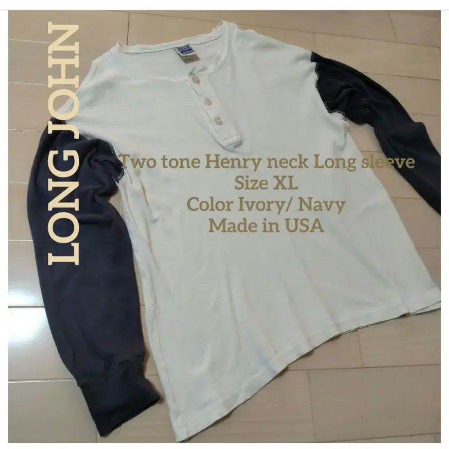 아이보리 바디 컬러에 소매가 네이비인 투톤 사양의 롱티입니다.