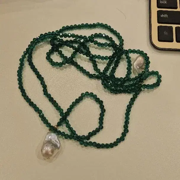 그린 컬러 비즈와 펄의 롱 목걸이, 2개의 펄 참이 특징입니다. 한국 서울 셀렉 shop 구매 엘레강트 - 색상: 그린 컬러 - 소재: 펄, 비즈 - 디자인: 롱 목걸이 - 특징: 2개의 펄 참 포함 방문해 주셔서 감사합니다.