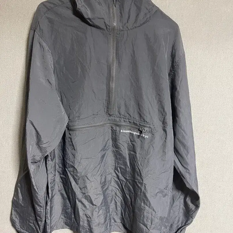 경량 컴팩트 그레이 나일론 자켓, 프론트 포켓 부착으로 편리함. - 브랜드: KINASHI CYCLE - 사이즈: XL - 색상: 그레이 - 특징: 프론트 포켓 부착 상태는 사진으로 판단해 주세요. #나일론자켓 #아노락후드티 #키나시사이클 #키나시노리타케