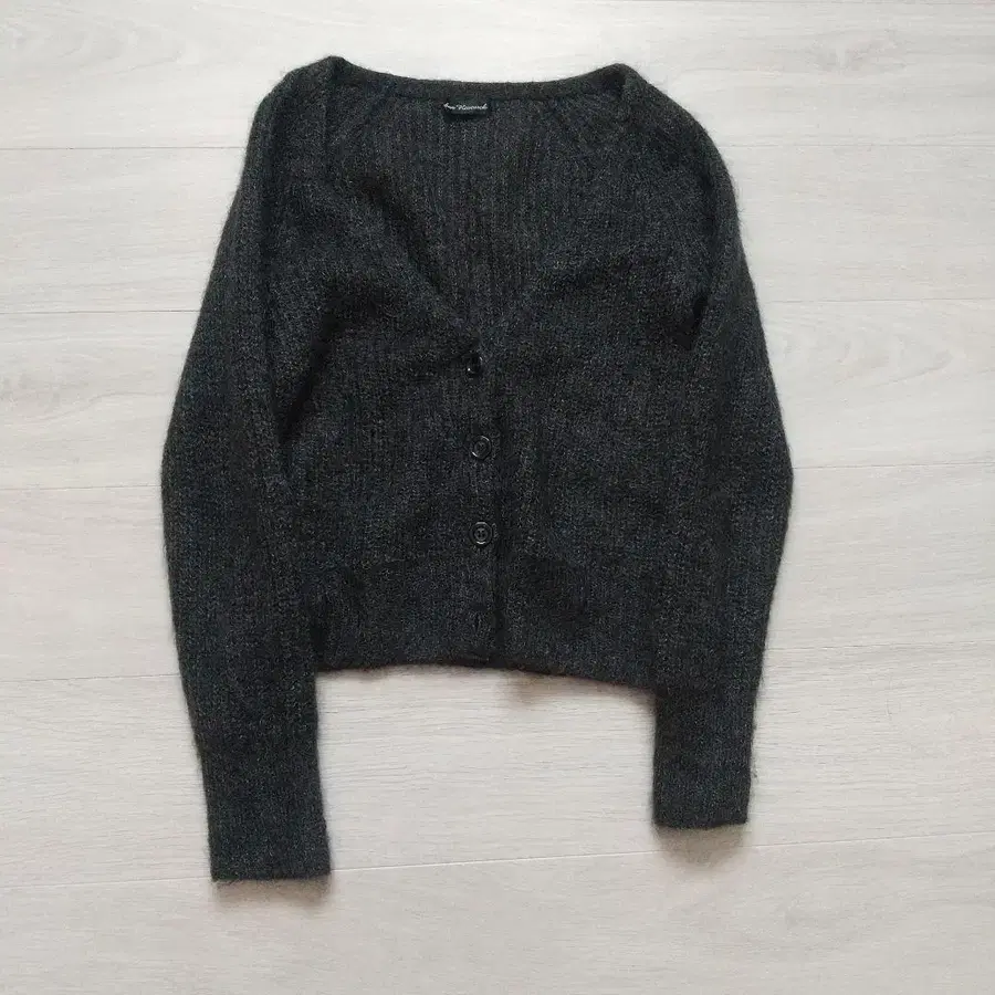 다크 그레이 색상의 긴팔 가디건, 버튼 4개. 거의 블랙에 가까운 다크 그레이 색상입니다. 사진 1번과 2번이 실제 색상과 가장 비슷합니다. 모헤어 55% 나일론 30% 울 15%