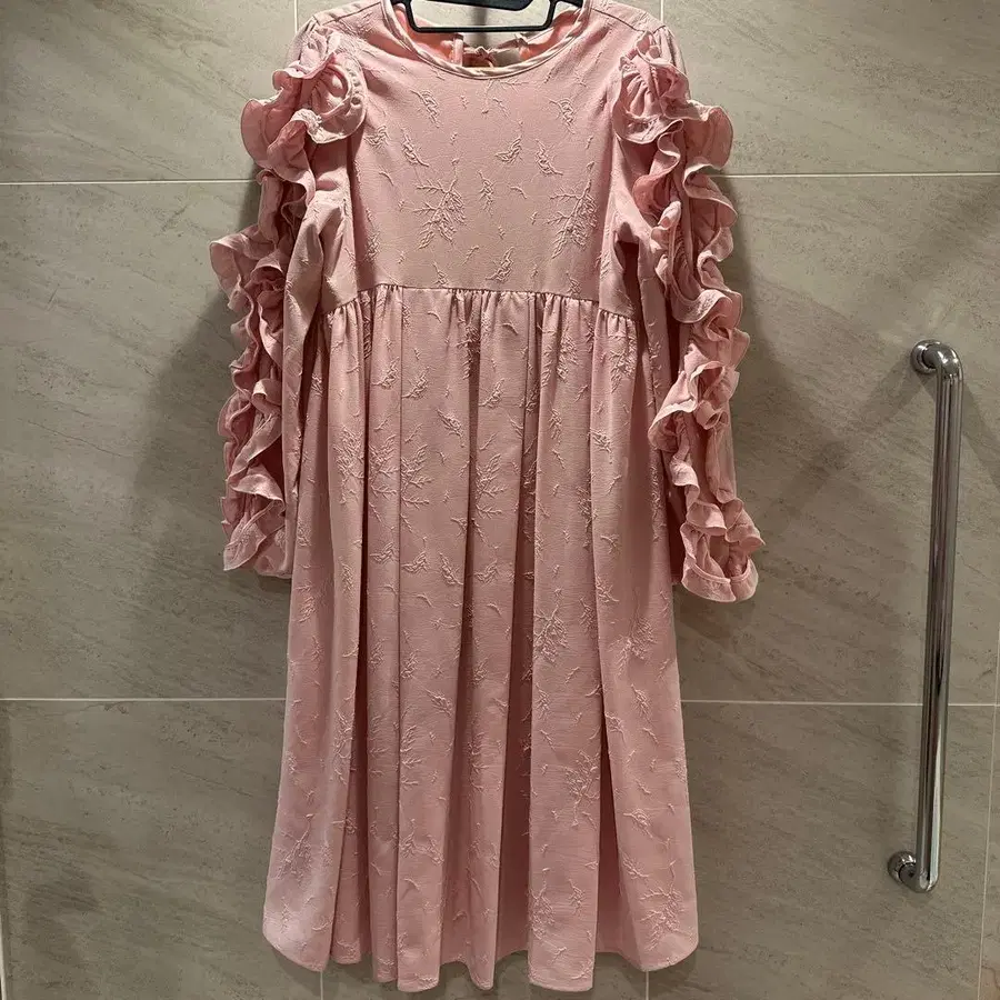 프릴이 달린 긴팔 핑크 원피스, 자수 원단으로 A라인 디자인. - 색상: 핑크 - 디자인: 프릴이 달린 긴팔 - 소재: 자수 원단 - 스타일: A라인 - 소매 특징: 프릴 방문해 주셔서 감사합니다. 사이즈 - M