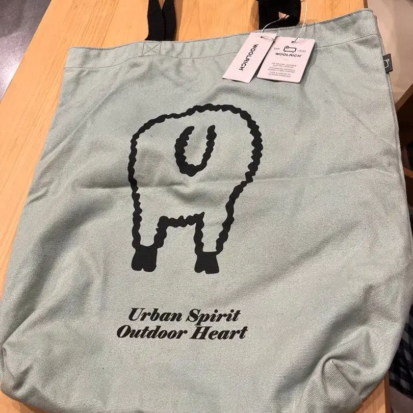 울 리치 라이트 그린 토트백, 양 디자인이 특징. 폭 40cm 미사용 데드스탁, 희미한 일광화상이 있습니다.