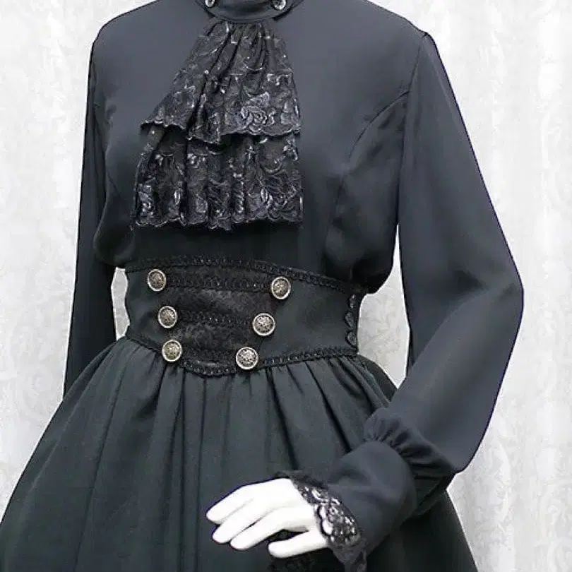 프릴과 레이스가 특징인 클래식한 블랙 블라우스. - 색상: 블랙 - 디자인: 프릴 장식 옷깃 - 소재: 쉬폰 - 장식: 레이스 - 스타일: 클래식 - 버튼: 장식 버튼 포함 방문해 주셔서 감사합니다.