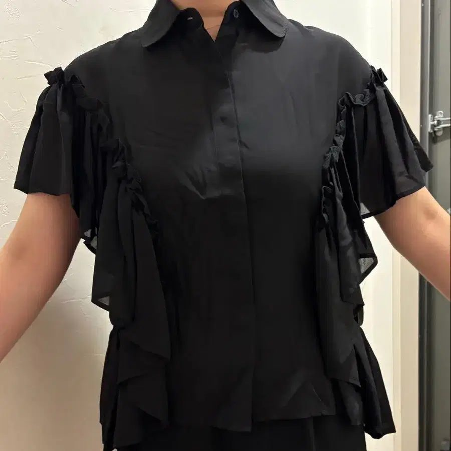 그레디 브릴리언트 소매 프릴 블랙 반팔 셔츠