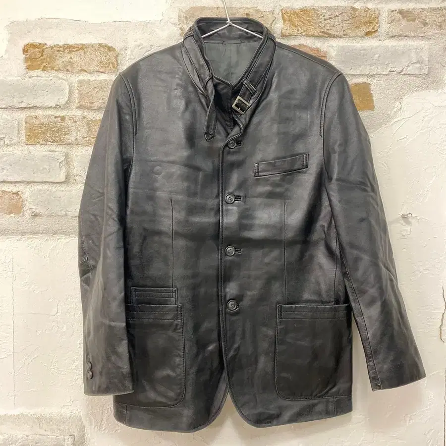 스탠드 카라 블랙 가죽 자켓, 버튼이 달린 4개의 포켓이 있습니다.