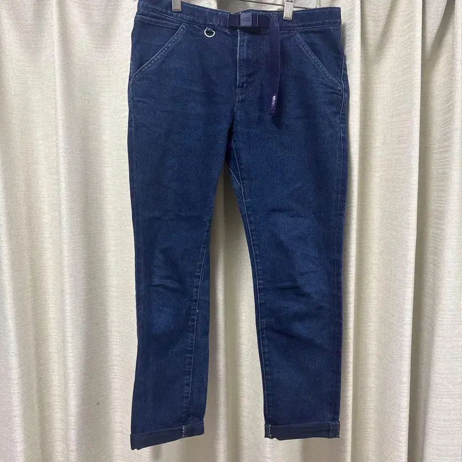다크 블루 스트레이트 데님, 버클이 달린 웨빙 벨트와 함께 캐주얼한 스타일에 최적입니다.