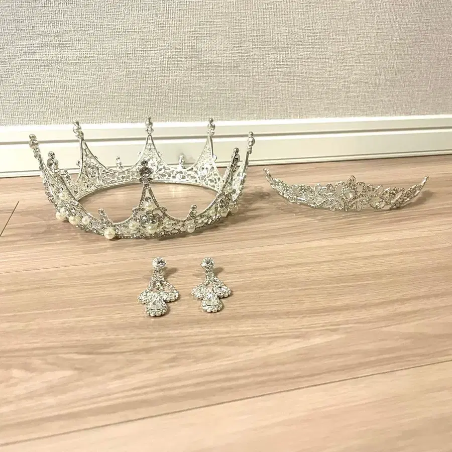실버 크리스탈 장식이 들어간 티아라, 크라운, 귀찌 세트입니다. 결혼식 당일 하루만 착용했습니다. 세트로 판매하지만, 낱개 판매를 원하시면 티아라 1500엔, 크라운 2000엔, 귀찌 1500엔으로 대응합니다. - 아이템 타입: 티아라, 크라운, 귀찌 - 색상: 실버
