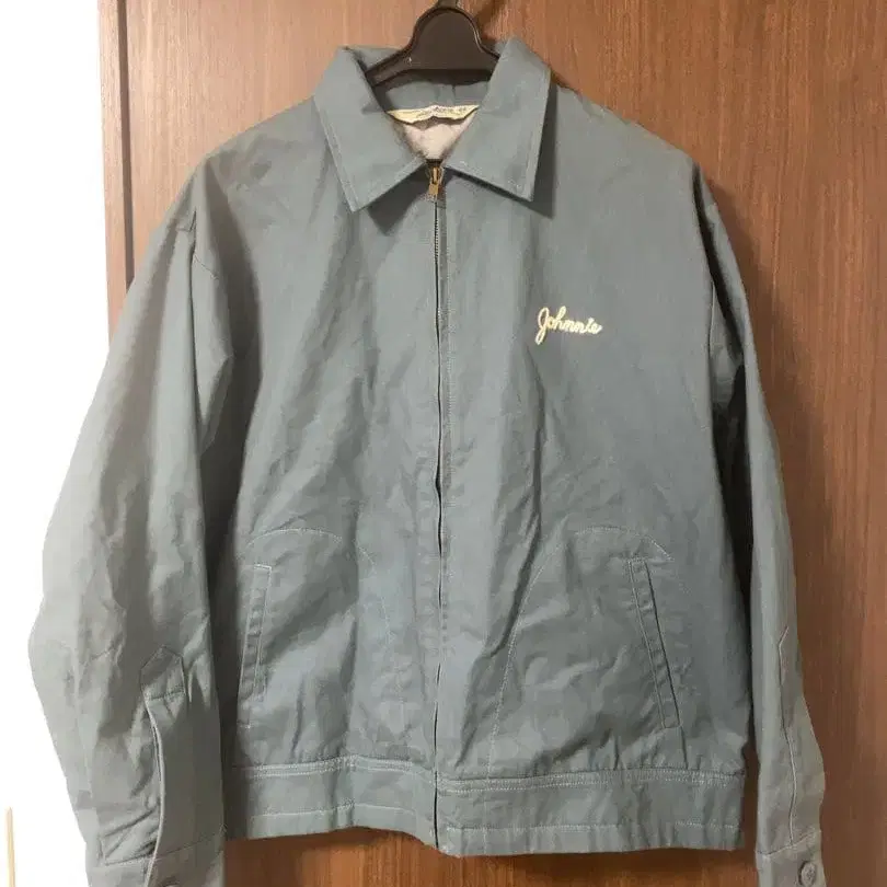 BACKERS 바커즈의 그린 집업 워크 자켓, 뒷면에 자수 로고 포함.