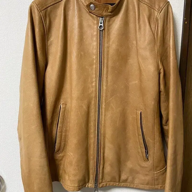 베이지 색상의 가죽 자켓, 스탠드 카라, 지퍼 포켓.