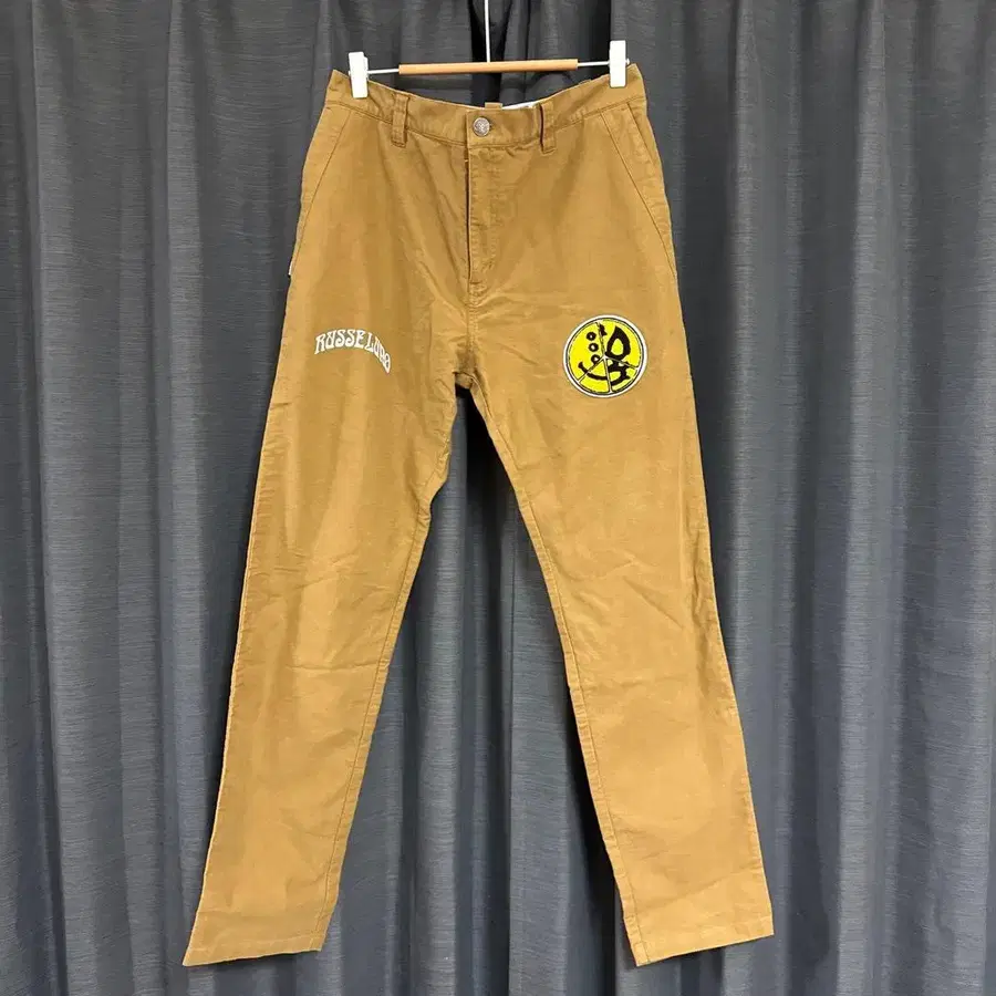스트레치 팬츠 - 브랜드: Russelino - 색상: 베이지 - 디자인: 자수 - 스타일: 슬림핏 - 사이즈: 7 - 허리 밴딩: 로고 실측치수 허리: 42cm / 밑위: 34.5cm / 인심: 69.5cm / 허벅지 폭: 33.5cm / 밑단 폭: 18.5cm 방문해 주셔서 감사합니다.