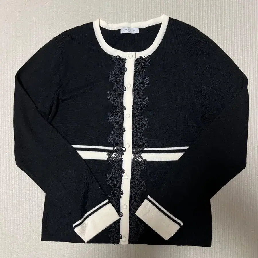 레이스 장식이 특징인 블랙과 화이트 가디건. - 브랜드: AUSTIN REED - 색상: 블랙, 화이트 - 디자인: 레이스 장식 포함 - 스타일: 가디건 - 소매 길이: 긴팔 방문해 주셔서 감사합니다.