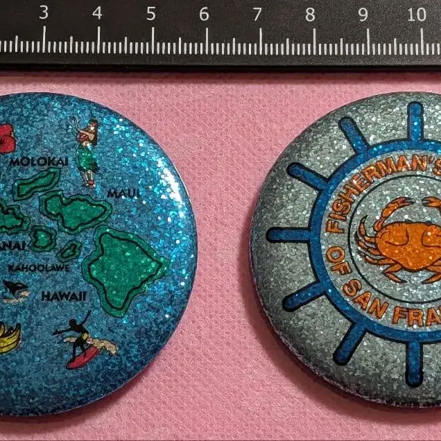 ☆ 반짝이는 라메 믹스 캔뱃지 2개 ☆✾ 하와이 지도 ✾ 샌프란시스코 피셔맨스 워프 ☆ 직경 약 5.8cm ☆ 새상품 미사용품 뒷면에 가격표 스티커 그대로 붙어 있습니다. ☆ 1990년경 현지 구매품 ☆ 귀한 상품입니다. 방문해 주셔서 감사합니다. 집에서 새상품 미사용 상태 그대로 소중히 보관하고 있습니다. 현지 구매한 매우 레어한 상품이라고 생각합니다. 새상품 상태로 보관하고 있지만, 매우 오래된 상품이기 때문에 뒷면에 녹과 피셔맨스 워프 쪽에는 가격표 스티커 부분에 얼룩이 있습니다. 매우 오래된 상품이기 때문에 미세한 스크래치나 연식 노후화가 있을 수 있으니, 이미지로 확인하시고 세세한 부분을 신경 쓰시는 분은 구매를 삼가해 주시기 바랍니다. 방수 포장을 꼼꼼히 하여 최대한 빨리 발송해 드리겠습니다. 잘 부탁드립니다.