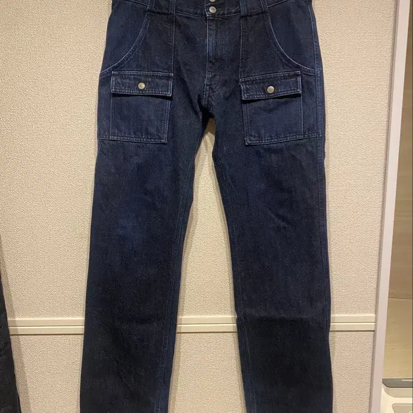 다크 블루 색상의 KOJIMA GENES 카고 팬츠, 프론트와 백에 포켓이 부착되어 실용성이 높습니다. - 브랜드: KOJIMA GENES - 스타일: 카고 팬츠 - 색상: 다크 블루 - 포켓: 프론트 포켓 x 2, 백 포켓 x 2 - 소재: 데님 정가 약 25,000엔 ⚠︎ 집에 고양이가 있습니다.