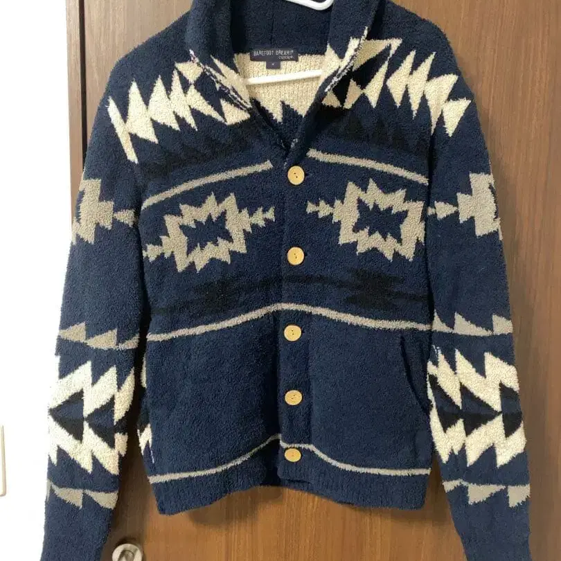 플리스 소재의 네이비와 아이보리 색상 기하학 패턴 가디건.