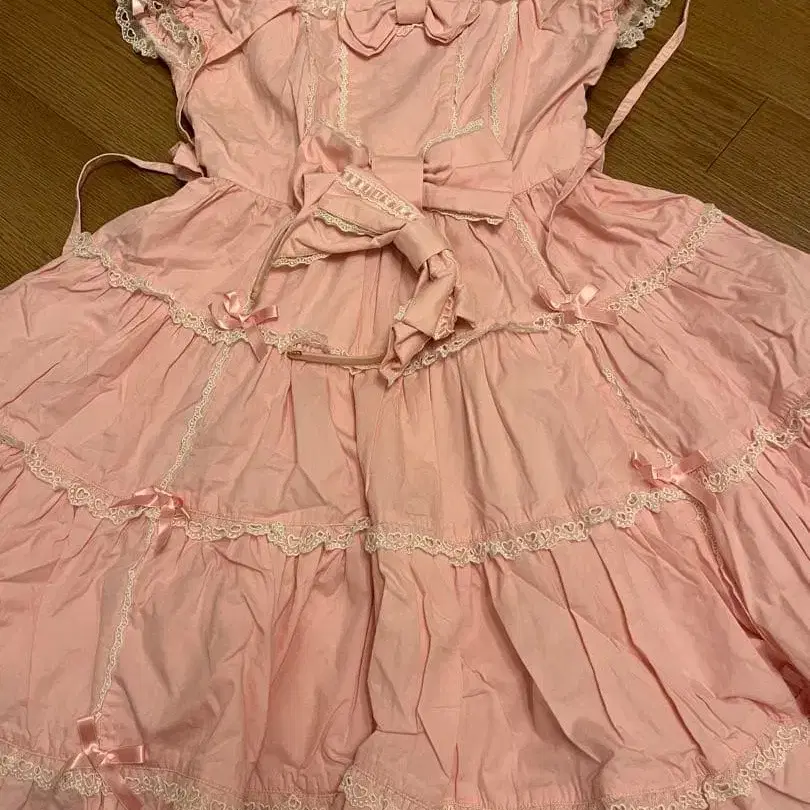 세트인지 불확실합니다. 원피스와 머리띠는 모두 Angelic Pretty 제품입니다. 황변이 있습니다 (머리띠의 황변은 사진으로 확인 가능합니다. 약간 녹처럼 보이기도 합니다). 원피스의 어깨 밴딩은 늘어나 있습니다. 주름, 사용감 있습니다. 프릴과 리본이 특징인 핑크색 슬리브리스 무릎 기장 원피스. - 색상: 핑크 - 디자인: 프릴 포함, 리본 포함 - 스타일: 슬리브리스, 무릎 기장 방문해 주셔서 감사합니다.