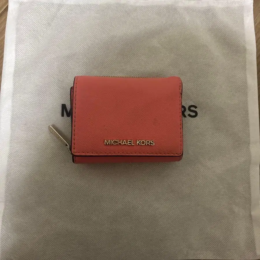 핑크색 합성 피혁 소재의 3단 폴더형 지갑, 카드 포켓 부착.