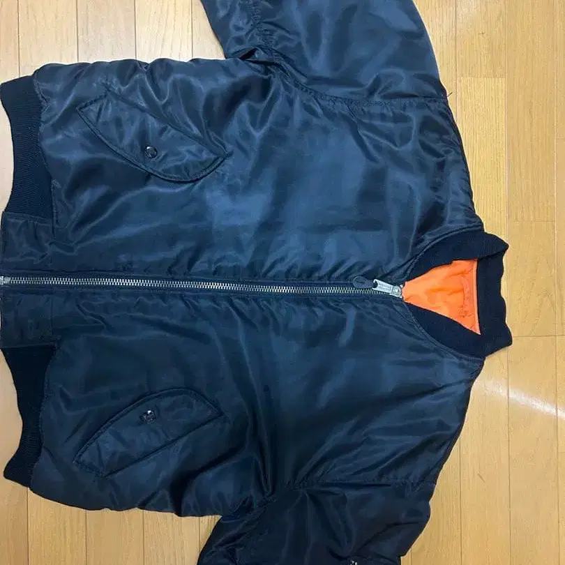 MA-1 스타일의 블랙 나일론 자켓, 오렌지 안감과 플랩 포켓 부착. - 색상: 블랙 - 안쪽 색상: 오렌지 - 디자인: MA-1 스타일 - 소재: 나일론 - 포켓: 플랩 포켓 방문해 주셔서 감사합니다. 사이즈 - L 팔 부분이 약간 올풀림이 있습니다.