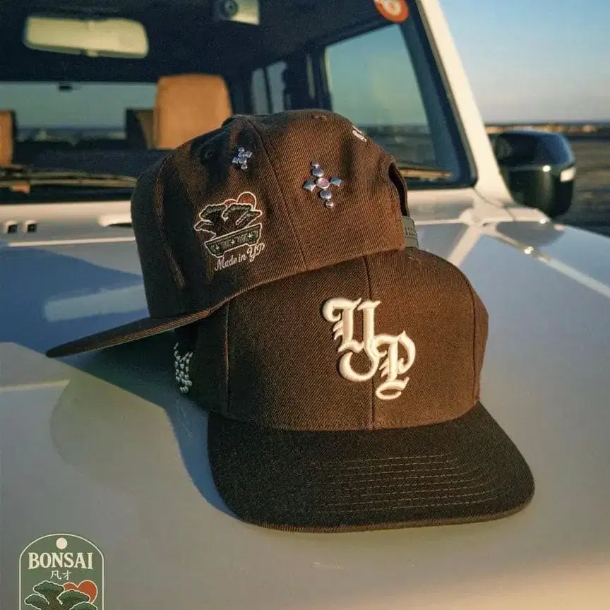 MADE IN YP x CRIB PHAT -BONSAI CAP-은 프론트에 YP 로고를 아이보리 컬러로, 사이드에는 MADE IN YP의 인기 모티브인 본사이 로고를 자수로 표현하여 일본 특유의 에센스를 담은 세련된 디자인이 특징인 캡입니다.
