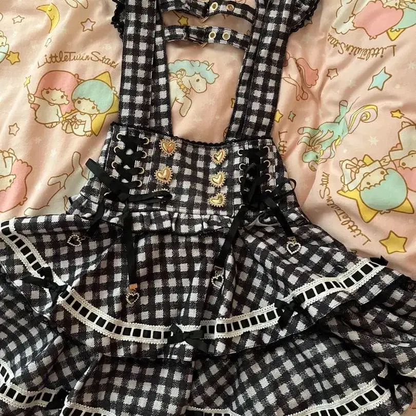 레이스업 서스펜더 치마바지 택 없음, 미사용 새상품 - 색상: 블랙, 화이트 체크 무늬 - 디자인: 프릴이 달린 서스펜더 - 스타일: 숏팬츠 - 장식: 버튼과 리본 포함 - 특징: 스트레치 소재 샘플 상품, 즉시 구매 가능, 가격 인하 불가 리즈리사, 지뢰, 양산