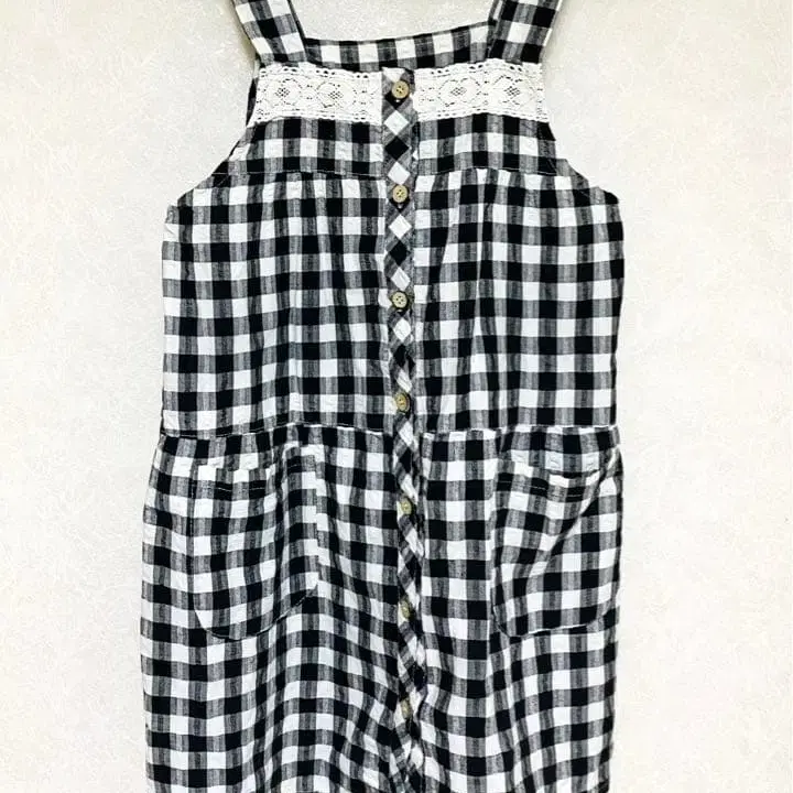 자동 번역되었어요. 원문보기블랙 화이트 체크 무늬 슬리브리스 원피스, 레이스 디테일로 캐주얼에 최적.