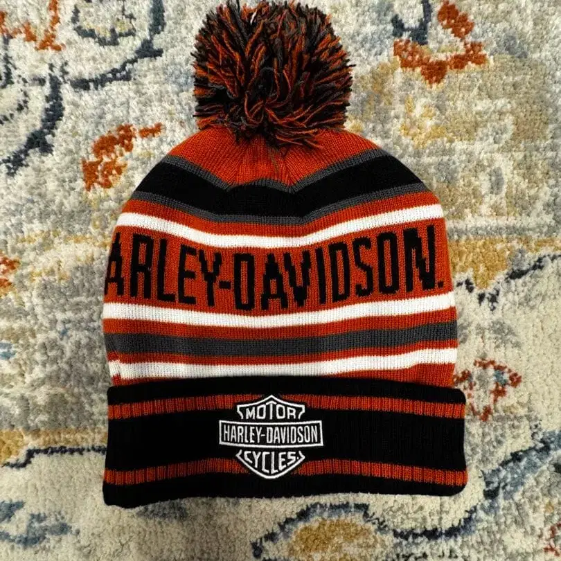폼폼이 달린 스트라이프 디자인으로, Harley-Davidson의 로고가 특징인 니트 모자. - 브랜드: Harley-Davidson - 색상: 오렌지, 블랙, 화이트 - 디자인: 폼폼 포함, 스트라이프 디자인 - 로고: Motor Harley-Davidson Cycles 방문해 주셔서 감사합니다.