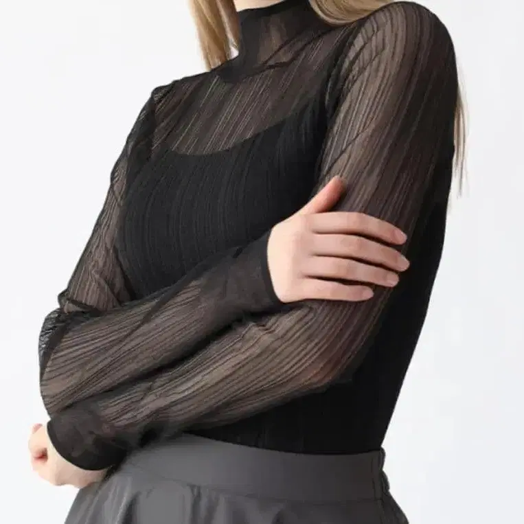 Aga 시어 랜덤 리브 PO 시스루 터틀넥 블랙 상의