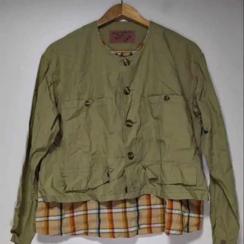 올리브색 버튼이 달린 자켓으로, 체크 무늬 이너가 특징입니다.