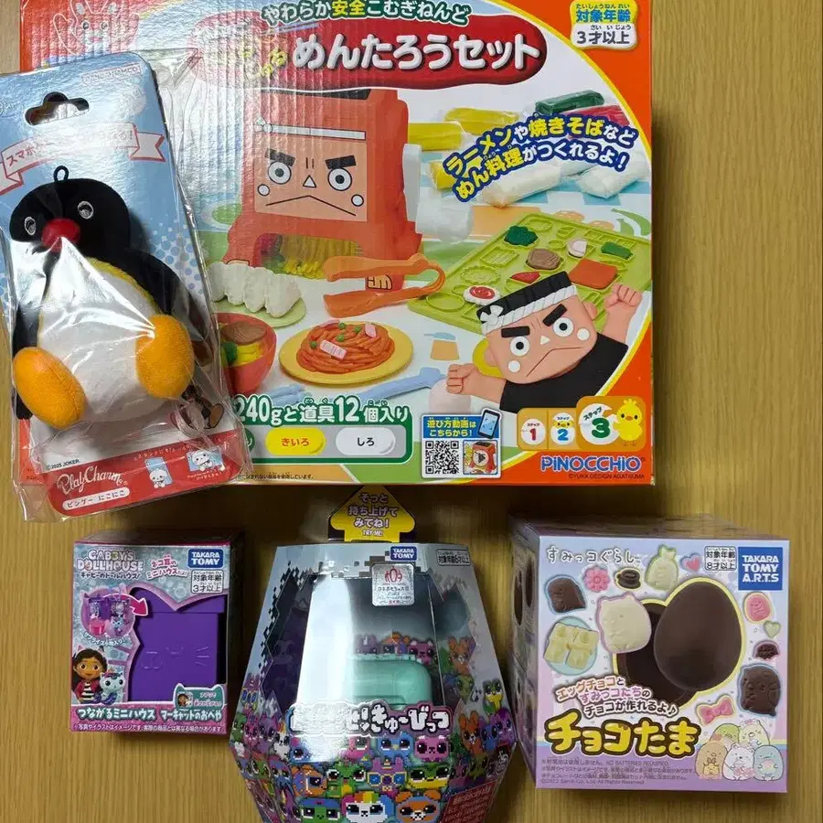 완구 5세트 1 점토에 쭉쭉 면타로 세트 2 스마트폰 케이스에 붙일 수 있는 핑구 3 스미코구라시 초코알 4 튀어나와라! 큐비츠 5 이어지는 미니 하우스 마카트의 방 모두 미개봉 새상품입니다.