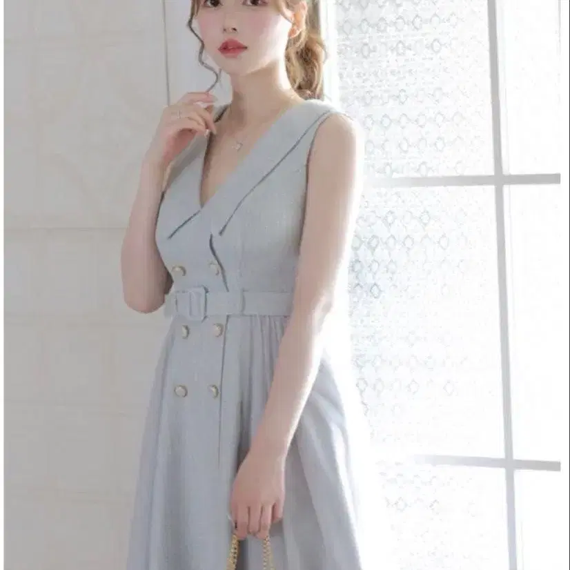 더블 버튼과 벨트가 있는 V넥 디자인의 그레이 드레스.