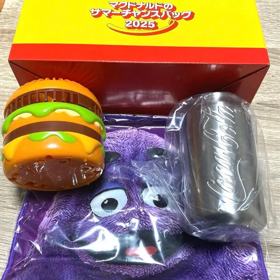 자동 번역되었어요. 원문보기맥도날드의 햄버거 모양 팬과 코카콜라 캔, 그리머스 타월이 세트로 구성된 2025년 썸머 캠페인 굿즈.