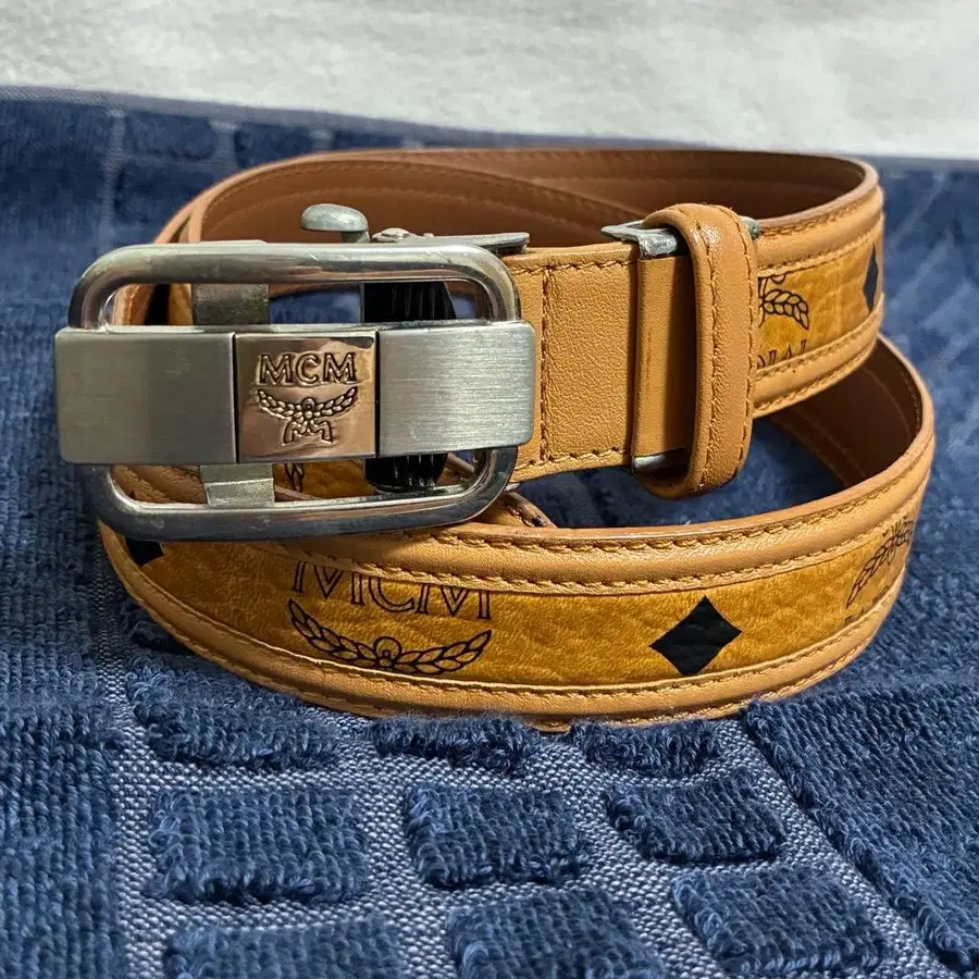 MCM 가죽 벨트입니다. 주름, 갈라짐이 보입니다. 갈라짐은 벨트 안쪽 전체에 있습니다. 자세한 내용은 사진으로 확인해 주세요. ◇ 길이: 버클부터 전체 길이 91.5