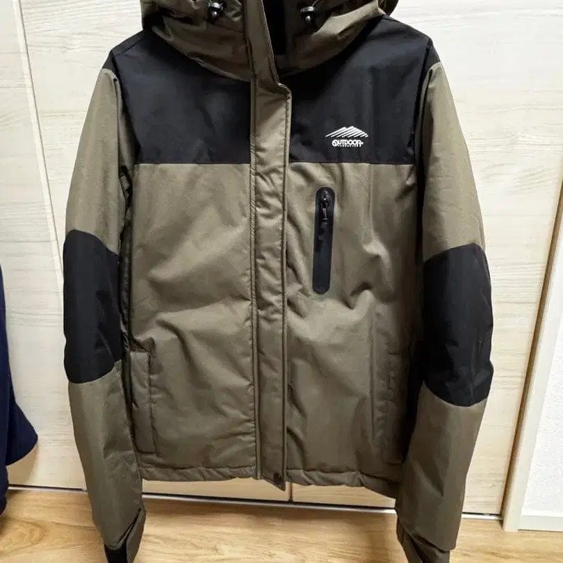 자동 번역되었어요. 원문보기올리브와 블랙 배색, 후드 부착된 L 사이즈 다운 자켓.