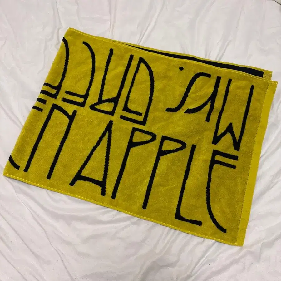 고대 문자 같은 [ Mrs. GREEN APPLE ]의 타이포그래피를 배치한 스포츠 타월입니다.