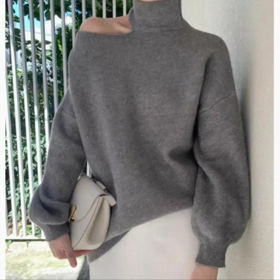 컷 아웃 하이넥 니트 그레이