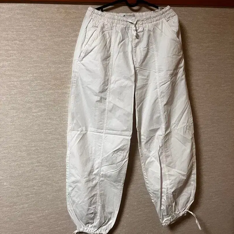 화이트 색상의 허리밴딩과 밑단 조임 디자인의 워크 팬츠. - 색상: 화이트 - 디자인: 허리밴딩, 밑단 조임 - 포켓: 사이드 포켓 있음 방문해 주셔서 감사합니다.