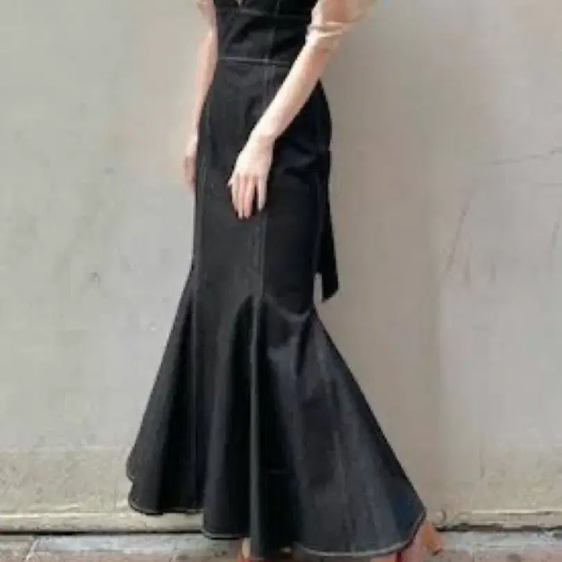 뷔스티에 같은 가슴 부분 커팅과 머메이드 실루엣의 스커트가 여성스러운 데님 원피스.