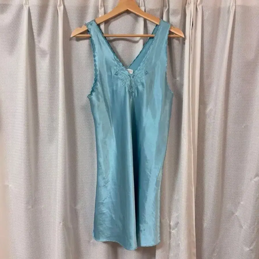 스카이블루 새틴풍 슬리브리스 튜닉, V넥 디자인과 자수가 특징입니다.