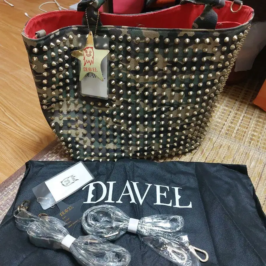 미사용 새상품인 DIAVEL 카모플라쥬 토트백입니다. 남녀 누구나 소지하고 있습니다. 스터드는 한쪽에만 있어 몸에 닿는 쪽은 스터드가 없어 아프지 않습니다.